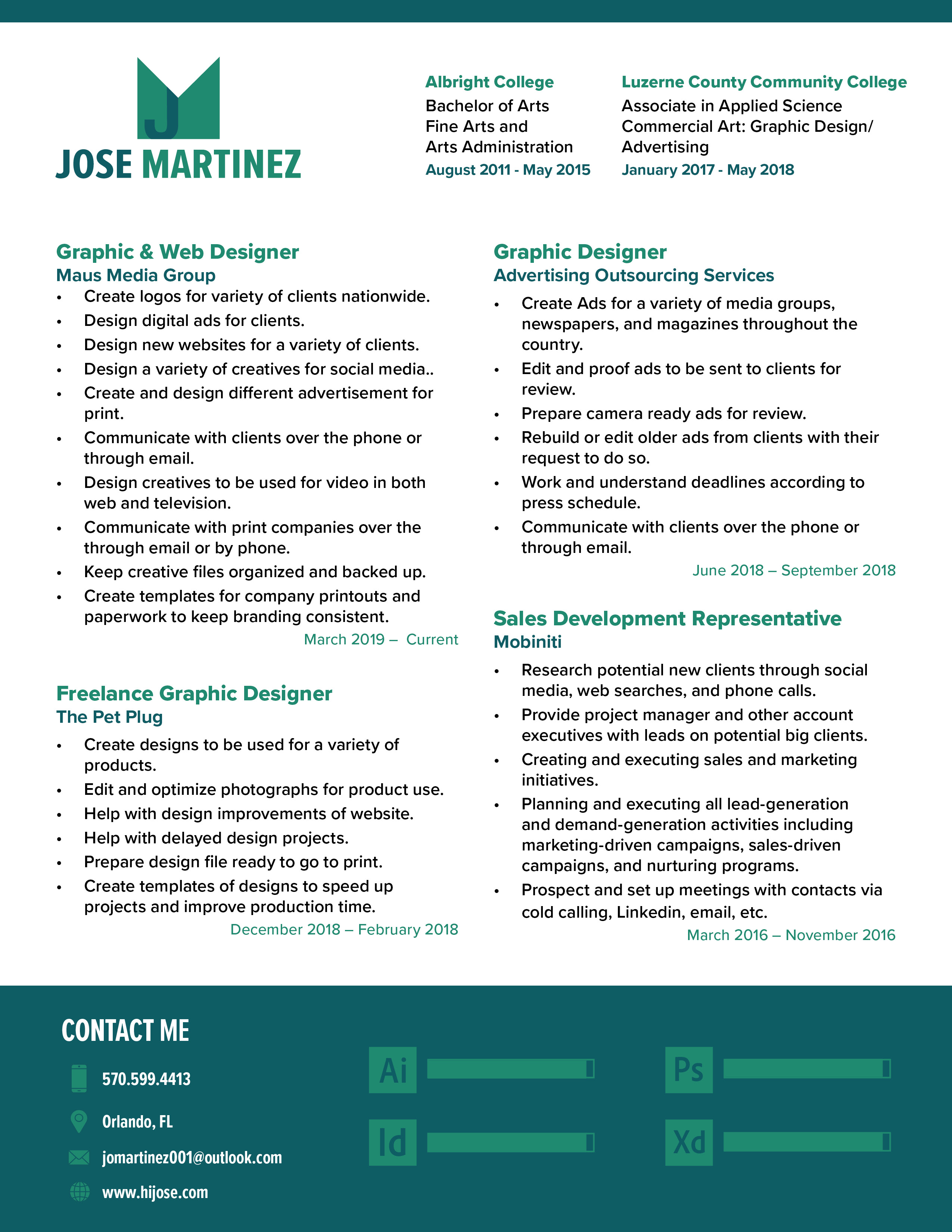 Experienced Designer with a demonstrated history of working in the marketing and advertising industry. Skilled in Adobe Creative Cloud, Web Design, and UI Design. Strong print and digital design professional with a Bachelor’s degree (B.A.) focused on Fine Arts and Arts Administration. Associate's degree (A.A.S) focused on Communication Arts: Graphic Design and Advertisement.